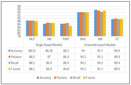The experimental results shown in Figure 7 depict that all of the ensemble-based models outperformed concerning all measures including accuracy, recall, precision, and F-score in comparison with single-based classifiers. Figure 7 shows the performance of models through bar charts and numeric terms.