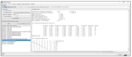 WEKA was used to evaluate the proposed classification model and to make comparisons. In this study, different experiments were conducted sequentially to assess students’ performance. The comparison was made through various single base classifiers, ensemble-based classifiers, and fusion ensemble classifiers. The time complexity of each algorithm is also represented in terms of Big O notation which plays an important role in finding the efficiency of algorithms []. Additionally, a comparative analysis has been performed to discover performance improvements in different models. The experiments detected the efficient model in predicting student academic performance at the secondary level. To acquire precise results during evaluation, 10-fold cross-validation was used.