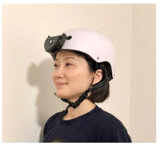 A calibrated Everfine SPIC-300 spectral irradiance meter was used to measure the illuminance and SID. The sensor of the spectral irradiance meter can be separated from the rest of the instrument, which it communicates with via Bluetooth. In order to estimate the corneal illuminance and SID while traveling safely, the sensor was mounted on a modified helmet. When the operator wore the helmet to conduct the measurements, the sensor was, therefore, in the center of the operator’s forehead, just above the eyes (Figure 1). After initiating the instrument, the equipment recorded the first measurement and automatically measured the subsequent light. The time taken for each measurement varied. The average measurement frequency during the trips was 1.4 recordings per minute. The measurements ceased when the operator manually stopped the equipment. A series of measurements were automatically and continuously recorded while the operator traveled.