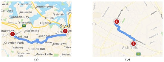 Examples of the GPS route for driving and walking: (a) driving from S point to E point; (b) walking from S point to E point.