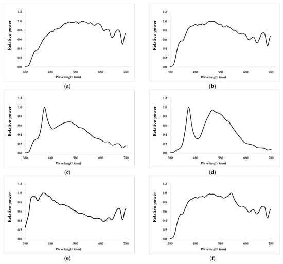 Representative relative spectral power distributions for the three commuting modes, for the two weather conditions (sunny and cloudy): (a) driving sunny; (b) driving cloudy; (c) train sunny; (d) train cloudy; (e) walking sunny; (f) walking cloudy.