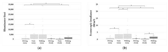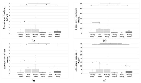 Box plots of the measured corneal illuminance and the five calculated α-opic irradiance values for the three modes of commuting under the two weather conditions (sunny and cloudy): (a) illuminance; (b) S-cone-opic irradiance; (c) M-cone-opic irradiance; (d) L-cone-opic irradiance; (e) rhodopic irradiance; (f) melanopic irradiance. The horizontal lines that divide the boxes into two parts denote the median (middle quartile). The boxes represent the inter-quartile range (the middle 50%), and the upper and lower whiskers show the highest and the lowest non-outliers. The individual points outside the boxes show the outliers. The cross in each box represents the mean. Asterisks indicate statistically significant differences between groups with a p-value < 0.05.