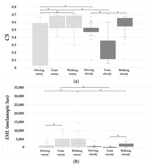 Box plots of the calculated CS and EML values for the three modes of commuting under the two weather conditions are shown in Figure 5. One-way ANOVA tests (p < 0.05) of CS and EML were performed in MATLAB to determine whether there are statistically significant differences between the different modes of commuting in different weather conditions. Any significant differences (p < 0.05) are denoted with asterisks in Figure 5. The average CS and EML values are shown in Table 4. The suggested desired criterion of CS is 0.3, with the condition that the light exposure is one hour in duration [12,32,34,35]. When the CS value is over 0.3, people who are exposed to such lighting conditions will have better daytime alertness and sleep quality [12,32,34,35]. As the average commuting time of employed Australians was one hour (66 min in mainland capital cities, and 48 min in others) [14], 0.3 is used here. As shown in Table 4, the average CS value for riding trains in cloudy conditions (0.25) is slightly below the desired criterion (0.3), but others are all above it. The suggested value of the EML depends on the space. For example, 200 melanopic lux is the recommended minimum level for a work area [19]. Although there is no recommended criterion for commuting, 200 melanopic lux is applied here, since the purpose of this study is to analyze daylight’s impact on people while they are commuting, before they spend the rest of the day at their workplaces. As shown in Table 4, all average EML values exceed the EML recommended value (200 melanopic lux), including riding trains in cloudy conditions (260 melanopic lux).