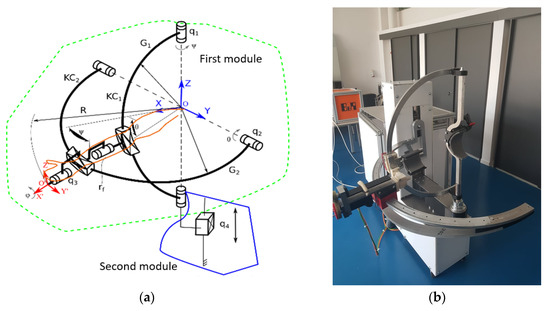 The flexion-extension movement q2 is performed by rotating the circular portion G2 around the Y axis of the same frame. The two circular portions G1 and G2 are connected by means of the passive kinematic coupling (rf), so that a spherical trajectory of the reference system O’X’Y’Z’ is obtained with respect to the point O, as shown in Figure 1b. The pronation-supination movement is defined by the q3 coordinate. The second module allows the vertical adjustment of the rehabilitation mechanism so that, with the help of a screw-nut system, the translation movement q4 is performed.