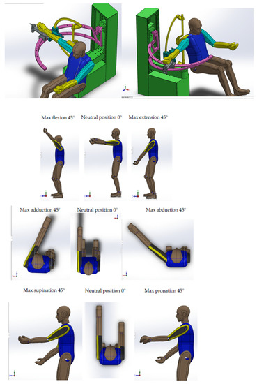 In this paragraph, by using MSC.ADAMS [44] a software frequently used for numerical simulations in scientific researches [45,46,47,48,49,50,51,52], the virtual dynamic analysis of the ASPIRE robot when used by a virtual patient who needs to rehabilitate the movements of the upper limb is performed. The aim of this analysis is to determine the external loads of the kinematic elements of the ASPIRE robot. These loads will be the input data to perform structural analysis of the robot elements with the ANSYS finite element analysis program. A virtual model of the ASPIRE robot assembly—a human virtual mannequin that respects the average anthropometric dimensions of the sample of human subjects considered in the experimental tests, namely a mass of 72 kg and a height of 1.68 m—has been made in Solid Works. The patient is incorporated into the design of the robotic structure, and the center of the sphere, which is defined by two circular guides, is put in the center of the patient’s shoulder, allowing for full arm motion while undergoing shoulder rehabilitation. The targeted motions of the ASPIRE robot are: