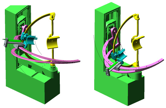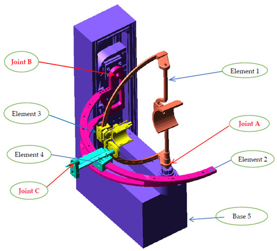 Elements 1 and 2 are connected to the base by joints A and B, respectively. For these couplings, we will present the connection forces and moments as calculated using the MSC.ADAMS program. A rotational joint is defined between elements 3 and 4, as shown in Figure 4. Element 3 (yellow) slides on the circular portion of element 1 by means of a guidance system.