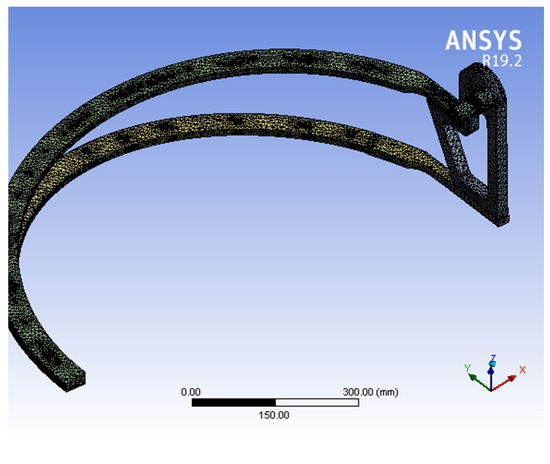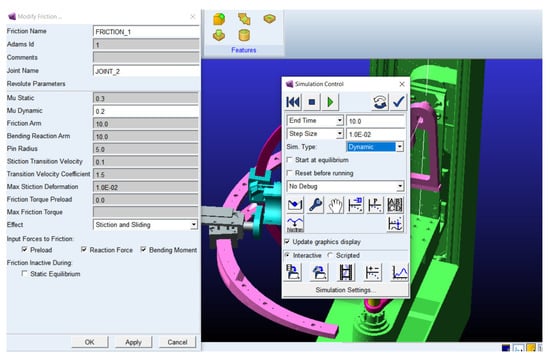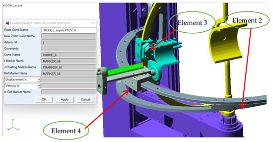 For a correct simulation of the contact between elements 3 and 4 and the circular portions of elements 1 and 2, the contact of 2 points on the load arm of element 3 on the circular guidance system of element 1 was defined, as shown in Figure 5. The dynamic model is finalized taking into account this aspect, namely the contact between the elements running on the circular portions of the multi-body model, as well as the external forces given by the weight of the upper limb. For the dynamic analysis, we joined the dummy’s arm with the mounting brackets of the forearm and the human arm. The WSTIFF solver and the SI2 integration algorithm were used to solve the dynamic model.