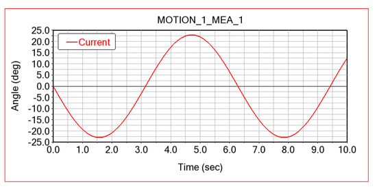 In order to analyze the dynamic behavior of the robot/mannequin assembly, harmonic laws of motion of the form: 0.4 × cos (1 × time), with an amplitude of 45 degrees and the period of 6.3 s were defined for the drive motors of each module. The time variation graph for the law of motion of the motors performing the rehabilitation movements is presented in Figure 7. In MSC.ADAMS, the implemented law of motion is defined as MOTION_1 or MOTION_2 for the second module, and in Figure 7, a measurement of the angle from the motor joint has been made. These parameters that define the amplitude and period of the movement were chosen because the laws of motion that will be done in the numerical simulation must be similar to the movement recommended for rehabilitation prescribed by the physiotherapist.