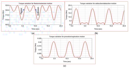 ADAMS simulation computed torque for: (a) the flexion-extension module; (b) the adduction-abduction module; (c) the pronation-supination module.