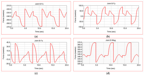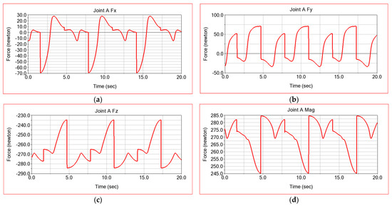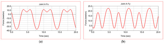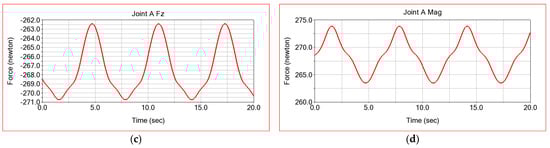 In each of these situations, the results obtained are presented and commented on. Thus, by numerical simulation in MSC.ADAMS, we obtained the connecting forces from the kinematic torques as well as the actuation moments of the robot modules. We obtained these data in the first phase without considering the friction in the couplings; the results are presented in Figure 9, Figure 11 and Figure 12. In the next phase, we also considered the friction from the kinematic torques of the robot, with the results obtained for the actuation moments being presented in Figure 14 and for the connecting forces in Figure 15 and Figure 16. It is noted that if we introduce in the simulation the real operating conditions, the results obtained are much closer to the real ones obtained experimentally.