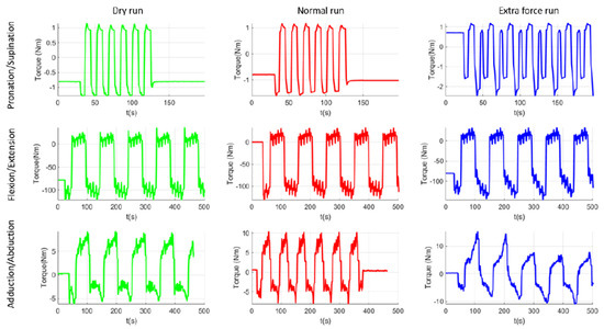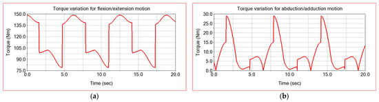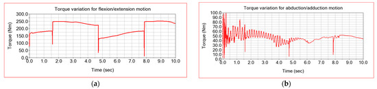 In the first phase, a dynamic simulation with the specified laws of motion, without taking into account the friction in the kinematic joints of the robot, was performed. The results obtained for this simulation, meaning the variations of the motor moment calculated by numerical simulation in ADAMS when simultaneously performing those three types of movement—flexion-extension, adduction-abduction and pronation-supination of the arm—are presented in Figure 9.