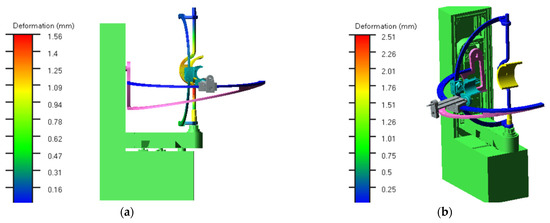 The maps with the distribution of the displacements recorded along the X and Y axes of the coordinate system are presented in Figure 23. The maximum values recorded are relatively small, at 0.40 mm along the X axis and 0.34 mm along the Y axis, and do not prevent the proper functioning of the module made of aluminum alloy Al 1060. The vertical movement of the module free end reaches 2.6 mm, keeping it within acceptable limits. It is noted that the value of the total elastic displacement obtained in ANSYS is close in value to the result obtained in MSC.ADAMS, presented in Figure 20, where the maximum values are 2.51 mm.