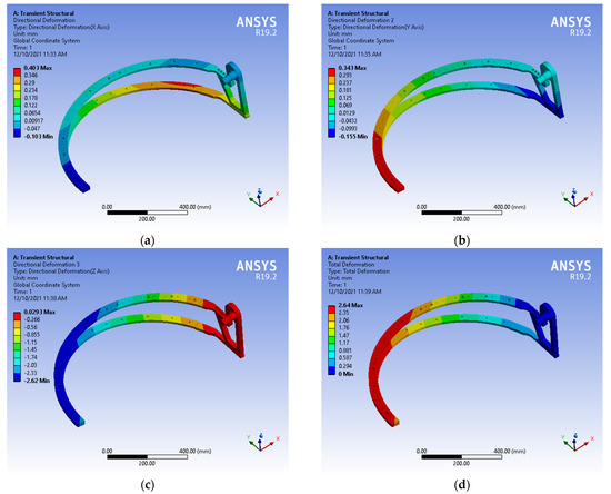 Distribution of displacements along the axes: (a) X; (b) Y; (c) Z and (d) total displacement.