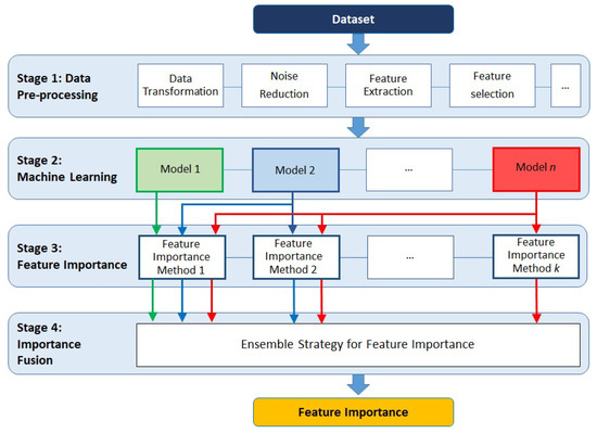 Figure 2 shows our MME Framework. On Stage 1, data undergo pre-processing, such as transformation, noise reduction, feature extraction and feature selection. This stage is required for our framework, as we need to ensure that the data have no inconsistencies and that the features used to train the machine learning models are orthogonal by removing noise and features that are collinear, which could negatively impact the model’s performance. The preference for features with low correlation guarantees that the feature importance calculation does not attribute random values of importance because a set of features contains similar information. No pre-processing is performed for this paper since the data are artificially created and undesirable features such as noise or non-informative features are kept to study the properties of the feature importance ensemble. On Stage 2, ML models are applied to the pre-processed data; subsequently, model-agnostics feature importance methods are applied to the ML models (Stage 3). The feature importance results are fused into a final feature importance in Stage 4.