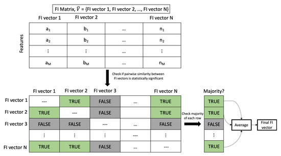 The working of RATE feature importance ensemble strategy. The feature importance (FI) vectors undergoes a rank correlation pairwise comparison to determine if the similarity between FI vectors is statistically significant (p-value < 0.05). A value of ‘TRUE’ is assigned if the two vectors are similar; otherwise, a ‘FALSE’ value is assigned in a truth table. Each row of the truth table goes through a majority vote to determine if the FI vector is accounted for when calculating the final FI.