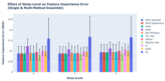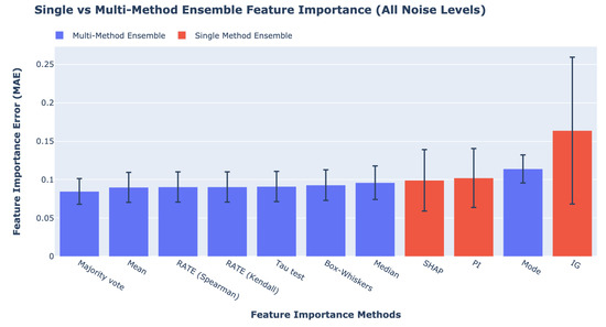 Figure 5 shows the feature importance results of SME and the MME Framework with different fusion strategies averaged across three different noise levels in the data. The results on the effect of noise in data on ensemble feature importance using the RMSE and metrics are shown in Sections S1.3 and S1.4 of the Supplementary Material. The best performing ensemble method averaged across all noise levels is MME Framework using majority vote. The MME Framework that uses majority vote outperforms the best SME method, SHAP, by 14.2%. In addition, Table 4 and Figure 6 show how the feature importance errors change for all SME and MME Framework methods as the noise level increases. In Table 4, we observe that the MAE decreases marginally, from a noise level of 0 standard deviations to 2 standard deviations, and then, it increases again by four times the standard deviation. The addition of 2 standard deviation noise to the dataset improves the generalisation performance of ML models, leading to lower errors [51]. However, the feature importance errors increase when the noise in the dataset reaches four times the standard deviation, indicating that the noise level has negatively impacted ML model performance. Overall, however, the noise levels have little effect on the feature importance errors. The results also reveal that the MME Framework with majority vote achieves the best feature importance estimates for our data.