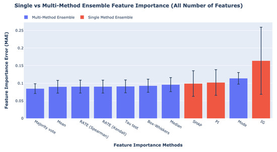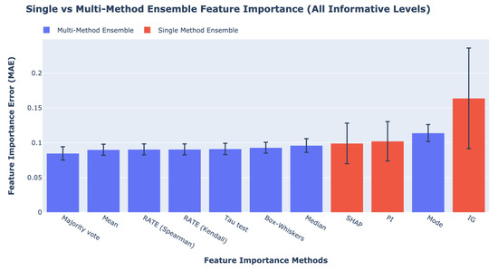 Overall, the results show that our MME Framework outperforms SME for our case studies. In particular, the MME Framework with majority vote as an ensemble strategy for the three different combinations of factors—(i) noise level, (ii) feature informative level, and (iii) number of features—has achieved the best results. The robustness of our framework compared with SMEs becomes even more evident as the number of features and the number of informative features increases. The results also reveal that the noise in the data does not affect the final feature importance estimates, as there are no significant changes as the noise increases.