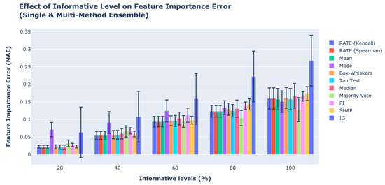 Figure 7 presents the feature importance MAE error for all SME and the MME Framework with different fusion strategies averaged across five different feature informative levels in the data. The results on the effect of feature informative levels on ensemble feature importance using the RMSE and metrics are shown in Sections S1.5 and S1.6 of the Supplementary Material. The best performing method is MME with majority vote followed by MME with mean and RATE. All MME Framework methods except for that with the mode outperform SME by more accurately quantifying the feature importance. The error bar (standard deviation) for the effect of feature informative levels in Figure 7 has a smaller range than the effect of noise and the effect of number of features. The low standard deviation indicates that the feature informative levels explain most of the variances. From Table 5, we observe that, when 20% of the features are informative, the best feature importance methods are MME Framework with Modified Thompson tau test and median, and they outperform the best SME method, SHAP, by 9.1%. For the 40% feature informative level, the MME Framework with RATE (Kendall and Spearman) and mean have the lowest errors, with 6.9% improvement over SME with SHAP. For the 60% feature informative level, the MME Framework using RATE (Kendall and Spearman) have the best results, with a 4.1% improvement over SME with SHAP. Furthermore, the MME Framework with majority vote obtains the lowest error for both 80% and 100% feature informative level. The best performing SME is using PI. MME with majority votes outperforms SME’s best results by 25.4% and 23.0% for 80% and 100% feature informative level, respectively.