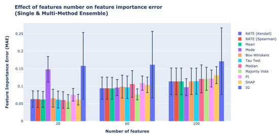 Figure 9 depicts the average of all SME and the MME Framework with fusion methods across 20, 60, and 100 features. The results on the effect of number of features on ensemble feature importance using the RMSE and metrics are shown in Sections S1.7 and S1.8 of the Supplementary Material. Similar to the effect of noise level and the percentage of informative features on feature importance errors, the MME Framework with majority vote has the lowest error across all features. The error bar for the effect of feature number in Figure 9 has a smaller range compared with the feature importance errors of the effect of noise but larger than the effect of number of features. From Table 6, we observe that, when there are 20 and 40 features, the method with the lowest feature importance errors is the MME Framework with majority vote, and it outperforms the best SME method—SHAP by 8.2% and 26.2%, respectively. For 100 features, the MME Framework using the mode is the most accurate method, and it outperforms the best SME method, PI by 20.5%. For SME, PI has lower feature importance errors compared with SHAP as the number of informative features and features increases.
