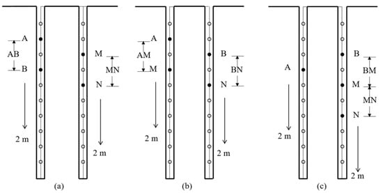Cross-hole ERT configurations; A and B represent the current electrodes and, M and N represent the potential electrodes: (a) dipole–dipole array (AB = n, n = 3, 5; MN = m, m = 2, 3, 4, 5, 6); (b) bipole–bipole array (AM = n, n = 2, 3, 4, 5, 6; BN = m, m = 2, 3, 4, 5, 6); and (c) pole–tripole array (BM = n, n = 2, 3, 4, 5, 6; BN = m, m = 2, 3, 4, 5, 6).