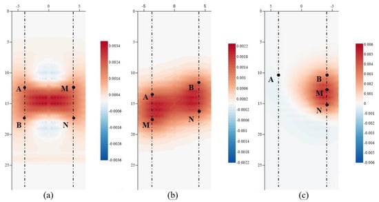 Sensitivity distribution of cross-hole ERT configurations: A and B represent the current electrodes, and M and N represent the potential electrodes: (a) dipole-dipole array; (b) bipole-bipole array; and (c) pole-tripole array.