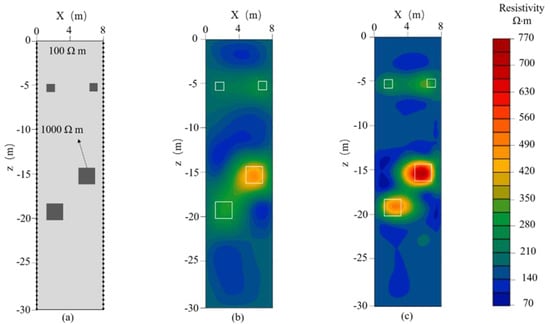 Simulation result with four targets: (a) model (background: 100 Ω·m; simulated boulder (high resistivity anomaly): 1000 Ω·m); (b) the results of the multi-configuration combination; and (c) the results of weighted inversion of the multi-configuration combination.