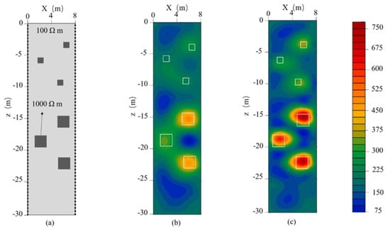 Simulation result with six targets, which included three near the surface and others deeper: (a) model (background: 100 Ω·m; simulated boulder (high resistivity anomaly): 1000 Ω·m); (b) the results of the multi-configuration combination; and (c) the results of the weighted inversion of the multi-configuration combination.