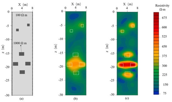 Similarly, the resistivity model, including six targets, with two scattered bodies near the surface and the other four deeper agminated bodies, is shown in Figure 5a. Two targets with a side length of 1 m were set at 3 m and 6 m, and four targets with a side length of 2 m were set at 15 m, 17 m, and 22 m. Only a deep body and a bar object can be seen in the result with no weighting factor (Figure 5b). Moreover, considering the volume effect of the electrical exploration and sensitivity distribution, the cross-hole ERT has good vertical resolution and weak horizontal resolution, and the resolution of the multiple targets at the same horizontal position is limited (Figure 5c).
