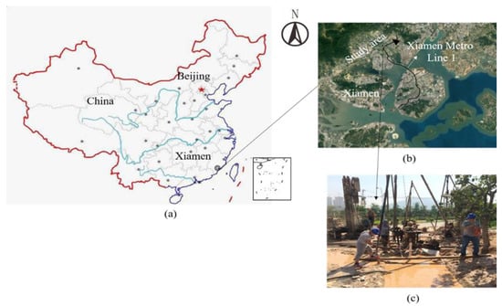 Geographical map of the Xiamen rail transit line 1 (between Station Tianshui to Station Xiamen North): (a) the location of Xiamen Metro on the map of China; (b) specific location of Xiamen Metro Line 1; (c) field test.