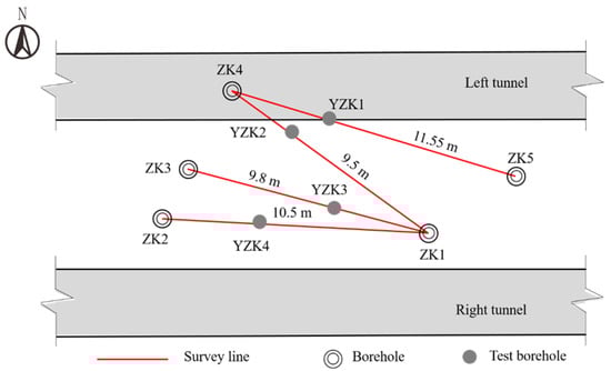 Considering that the boulders at the edge of the shield machine have a great impact on the cutterhead, the study was designed to detect the contour of the tunnel. Moreover, due to the limitation of the surface environment and the close distance between the left and right lines of the tunnel, only the space between the tunnels was surveyed in the detection process. Therefore, apparent resistivity measurements were made using the four survey lines arranged on the surface, using five existing boreholes, as shown in Figure 8. The lengths of the survey lines were 11.55, 9.5, 9.8, and 10.5 m, respectively, measuring from northeast to southwest. We used nonpolarized electrodes, and the electrode spacing on the cable was 1 m. To ensure the electrical contact between soil and electrodes, we poured water into the borehole to couple them. In practice, it was necessary to verify whether the results of the geophysical prospecting were precise. The results of the weighted inversion of the multi-configuration combination were compared with the actual field measuring results using the test boreholes. The locations of four test boreholes (YZK1–YZK4; Figure 8) were delineated using the results of geophysical prospecting.