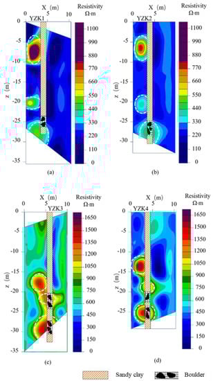 In YZK1 (Figure 9a), cross-hole ERT revealed three boulders, located at a depth of 5–10 m, depth of 18–22 m, and depth of 27–30 m. Correspondingly, the borehole revealed an abnormal body located at 23–27 m.