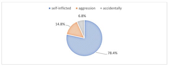 Among the main psychiatric disorders identified in the case studies studied were: depressive syndrome—17 cases (16% of total group 1), personality disorders—8 cases (7.5% of total group 1); 2 cases (1.9%) had dementia syndrome, schizophrenia, psychomotor agitation, and mental retardation. Mental disorders were identified in 62.5% of patients with self-inflicted mechanisms and only in 9.5% of those with aggression, without being noticed in patients with accidental mechanisms (p = 0.001).
