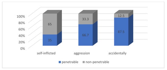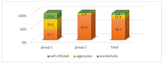 In the study by Al-Thani et al., the determined injury mechanism is represented in a proportion of 29% by road accidents, 17.6% by stabbing, accidental falls 9.8%, and aggression 7.8% [27]. Aich et al. reported 67 cases; 48 (71.6%) cases with injuries caused by aggression, 12 (17.91%) cases of accidental injuries, and 7 (10.44%) cases with suicide attempts [28]. In the study performed, on group 1, the lesion determining the mechanism by aggression (39.6%) was more frequently noticed, followed by the self-inflicted mechanism (39.6%) and accidental mechanism (22.6%); respectively on group 2, in 93.9% of patients, the self-inflicted mechanism was present, to the detriment of aggression (5.4%) and the accidental mechanism (0.7%). Accidental mechanisms were represented by: work accidents, car accidents, domestic accidents, and accidental falls.