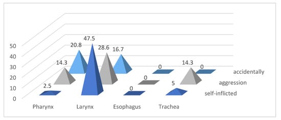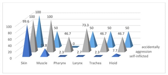In the patients of group 2 (n = 278), who died as a result of complex cervical traumas, the following lesional aspects were identified following the research of post-mortem examination reports (Figure 5): skin lesions were found in 99.6% of patients in group 2 (p = 0.939); muscle injuries were present in all patients with injuries caused by aggression and in 50% of those with accidental injuries, while the share of patients with injuries caused by self-inflicted mechanism was 23.8% (p = 0.001); pharyngeal lesions were found with relatively low weights both in the case of aggression (46.7%) and in the case of the self-inflicted mechanism (2.3%) (p = 0.001); laryngeal lesions were noted in 73.3% of patients with aggression and 50% of those with accidental mechanism, while the share of patients with autolytic mechanism was only 2.7% (p = 0.001); tracheal lesions were present in 46.7% of patients with aggression and in 50% of those with accidental mechanism, while in patients with self-inflicted mechanism the share was 2.3% (p = 0.001); hyoid lesions were found in 50% of patients with accidental mechanism and in 46.7% of those with aggression, percentage differences significantly higher than in the case of the self-inflicted mechanism where the weight was only 7.7% (p = 0.001) (Figure 5).