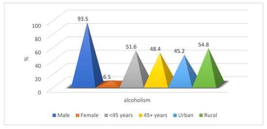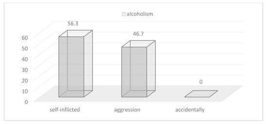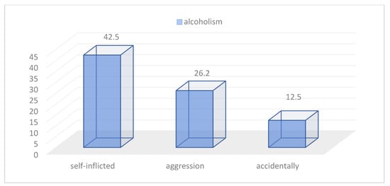 Alcoholism was identified in 29.2% of patients in group 1 (n = 106), of which 16% were diagnosed with acute alcoholism and the remaining 13.2% chronic alcoholism, of which 93.5% were male, 51.6% aged under 45, and 54.8% of rural residence (Figure 6). The correlation of alcoholism with the mechanism of production of complex cervical traumas was significantly observed in the case of self-inflicted in the proportion of 42.5%, followed by that by aggression 26.2% of cases and last but not least 12.5% in the case of accidental mechanism, obtaining after the application of the ANOVA test a p = 0.028 (Figure 7).