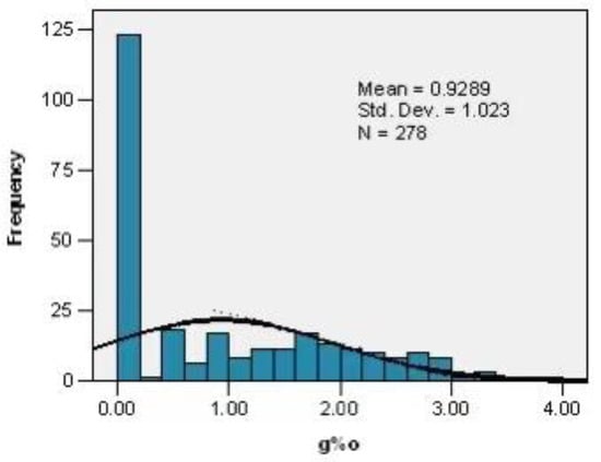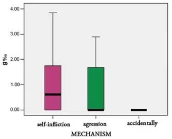 The blood alcohol concentration was compulsorily measured in all patients in group 2 (n = 278), and it varied in the range 0–3.85‰, recording an average level of 0.93 ± 1.02‰ and the median of 0.60‰, a standard deviation of 1.02, however, Skewness tests (p = 0.697) and Kurtosis (p = −0.733) suggest the normality of the series of values (Table 4, Figure 8 and Figure 9). In the case of group 2, it was found that the blood alcohol concentration was significantly higher in patients with lesions caused by self-inflicted mechanism, the average value being 0.94‰ with the standard deviation of 0.92‰, while in patients with lesions produced by accidental mechanism, the presence of alcohol was not detected. It should be noted that the aggressed patients also had a rather high blood alcohol level with an average value of 0.84‰, with a standard deviation of 0.87‰. The F test (ANOVA) was applied to the values of the three groups of patients, obtaining a p = 0.048. (Table 4 and Table 5). Regarding the mechanism of production of complex cervical traumas, alcoholism was correlated with the self-inflicted mechanism in 56.3%, respectively, with aggression in 46.7% of cases (p = 0.151), whereas in the case of accidental traumatic injuries, no blood alcohol concentration was identified (Figure 10).