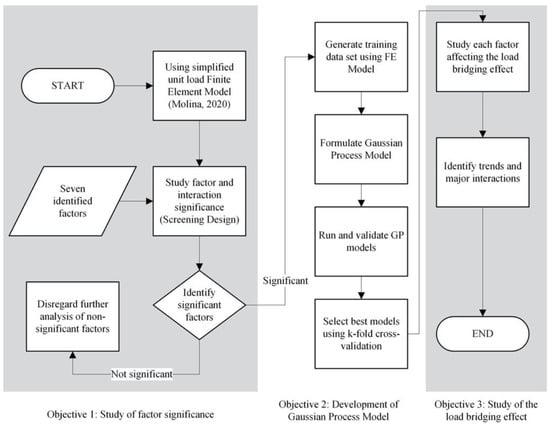 This research was structured to be presented in three main sections. First, a fractional factorial screening design was conducted to identify the significance of multiple factors that could have an influence on the load bridging effect on racked unit loads. Second, a Gaussian process model was developed, as a surrogate model, to increase the efficiency of the analysis and the potential of its application. In the third and final section, the developed Gaussian process model was used to conduct a detailed analysis on each of the significant factors. Special attention was paid to the interactions and trends observed. Figure 1 shows these steps in a summary flowchart of the research project.