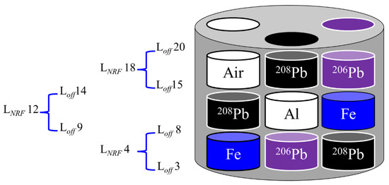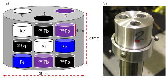 The results for the horizontal layers from L15 to L20 are shown in Figure 5. Two lead isotope rods (208Pb and 206Pb) were inserted into the two holes, while the third hole remained unfilled as shown in Figure 5a. Figure 5b shows the reconstructed images from to . The two high-attenuation areas corresponding to the 206Pb and 208Pb rods can be clearly observed but they cannot be distinguished. The low-intensity area at the third hole corresponds to the vacant space.