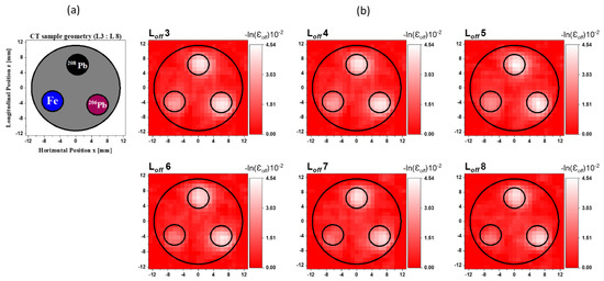 CT imaging can be performed by measuring the decrease in the gamma-ray intensity passing through a CT sample along a series of linear paths and various angles. The amount of decrease depends on the gamma-ray energy, the path lengths, and the material’s linear attenuation coefficients. Therefore, one can obtain a gamma-CT image for a sample using the gamma-ray transmission factor measurements of the off-resonance energy, known as off-resonance (εoff) attenuation, which originates from the atomic effect. The procedures of the 2D gamma-CT images calculation are detailed in references [13,14,21]. Since the height of the CT sample holder was 20 mm, we divided it into 20 layers and added two extra layers; one of the two extra layers was located below the bottom of the CT sample and the other above it. These layers were separated by a vertical distance of 1 mm. Therefore, the total number of scanned layers was 22. We assigned the labels L1 to L22 to the layers at the vertical distances of y = −1 mm to y = 21 mm, respectively. Consequently, we obtained one 2D gamma-CT image (25 × 25) with a resolution of 1 mm/pixel for each row of rods in the y direction of the CT sample scan. The pixel size was determined by the scanning step in the x direction. In total, 22 reconstructed 2D gamma-CT images were obtained, which we named to . Since Layer L1 was located beneath the CT sample holder and Layer L2 was located at the bottom edge of the holder, the LCS gamma-ray beam traveled underneath the rods. Therefore, the reconstructed images for the first two layers and did not show any characterization of the rods within the CT sample. Figure 3a shows the cross-sectional slices of the CT sample for the horizontal layers from L3 to L8. The total height of these layers was 6 mm, which was identical to the height of each rod within these layers. Two rods of enriched lead isotopes (208Pb and 206Pb) were inserted into two of the holes in the CT sample, and an Fe rod was inserted into the third hole. Figure 3b shows the reconstructed CT images from to due to the atomic attenuation measured by the LaBr3(Ce) detector. Because the lead isotope (206Pb and 208Pb) rods had the same atomic attenuation, the two high-attenuation areas in the white-colored area caused by the atomic process corresponding to the locations of these lead rods were plainly evident in all reconstructed images. However, it was difficult to discriminate between the two isotopes. Furthermore, the atomic attenuation caused by the Fe rod was smaller than that caused by the lead rods, making the Fe rod appears as a faint shadow.