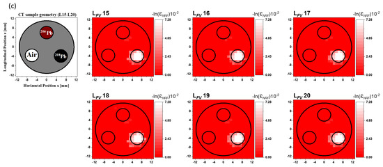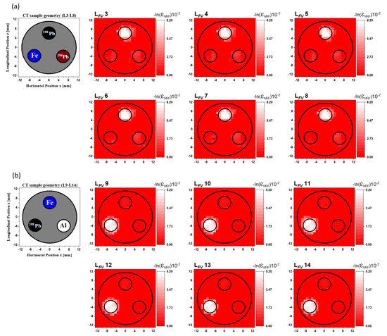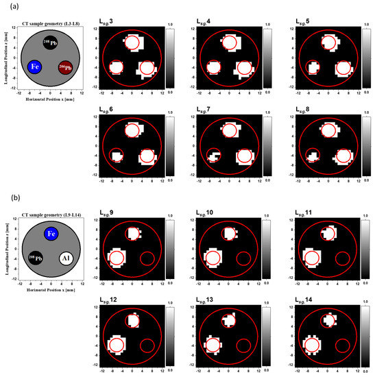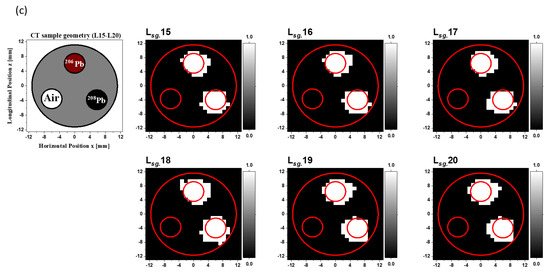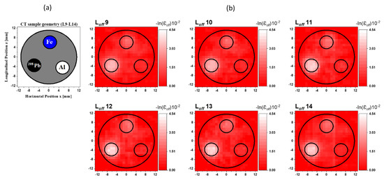 Figure 4a shows the cross-sectional slices of the CT sample for the horizontal layers from L9 to L14. The total height of these layers was also 6 mm. Rods of 208Pb, Fe, and Al were inserted into the first, second, and third holes, respectively. The reconstructed CT images from to are shown in Figure 4b. A high-attenuation area caused by the atomic process corresponding to the 208Pb rod is clearly visible in the reconstructed images. The atomic attenuation originating from the Fe rods was less than that caused by the 208Pb rod, making the Fe rod discernible but not as apparent. Since the CT sample holder was Al, the Al rod was not visible.
