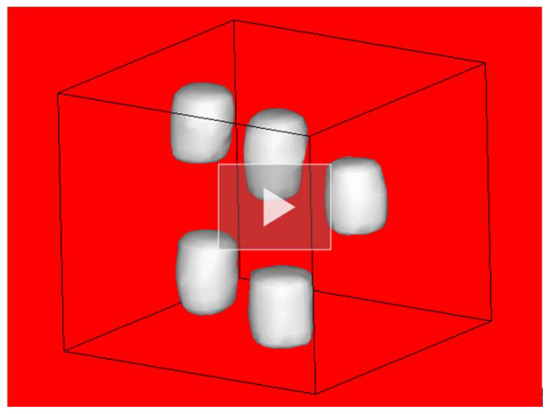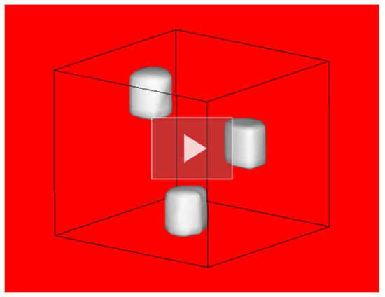 The 22 2D FV NRF-CT images were combined together using the MicroAVS data visualization tool to create the 3D FV NRF-CT image. We also adjusted a value within the intensity range of the 2D FV NRF-CT images as a threshold limit, so that only the intensity values greater than the threshold limit (208Pb rods) appeared on the 3D surface. Movie S2 shows a visualization of the fused CT-image of the NRF attenuation caused by the 208Pb isotope rods within the CT sample (pure NRF) in three dimensions. Figure 10 shows a shot of the 3D FV NRF-CT image, which was captured from the visual-ized 3D movie (see Movie S2 in the Supplementary Materials). The visualization clearly shows the locations of the enriched lead isotope (208Pb) rods. In contrast, the rods of 206Pb, Fe, and Al and the empty areas are not visible.