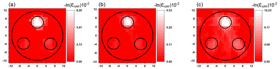The fused image obtained using the post-sum FV method shows the change in the intensity at each pixel but retains some of the background noise, so this method is useless for isotope quantification. Figure 11 shows a comparison between the 2D FV NRF-CT images for the layer L4 obtained by (a) the post-multiply FV method, (b) the post-multiply FV method without 2D gamma-CT image segmentation, and (c) the post-sum FV method.