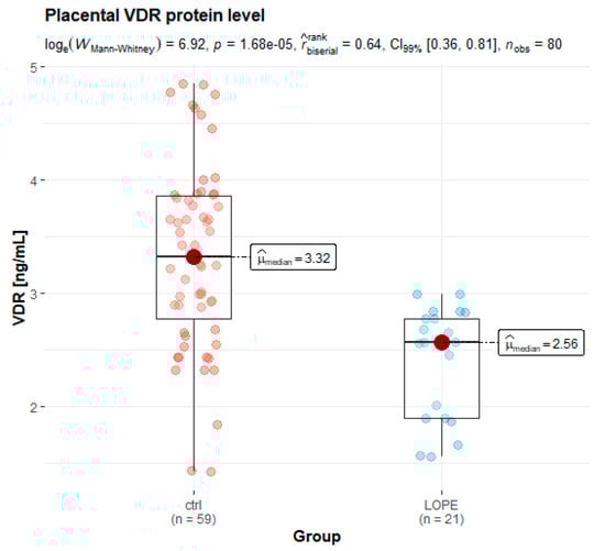 Box and whisker plots of placental levels of VDR protein in the LOPE group and healthy controls.