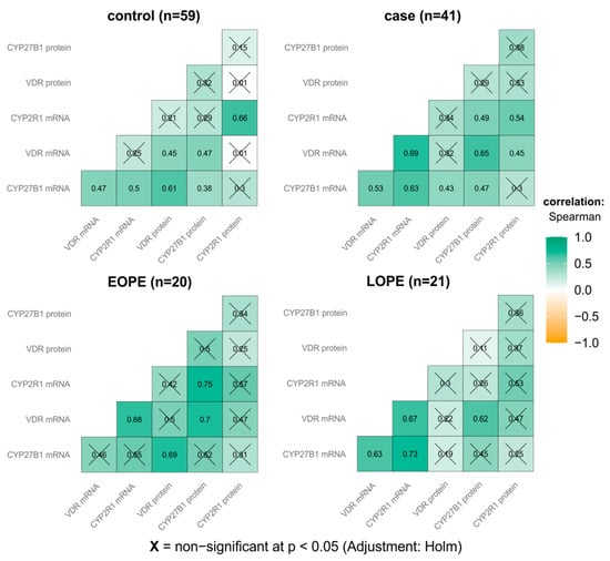 Correlation matrix of placental VDR, CYP27B1 and CYP2R1 mRNA and protein levels in preeclamptic women and healthy controls (inside each group).