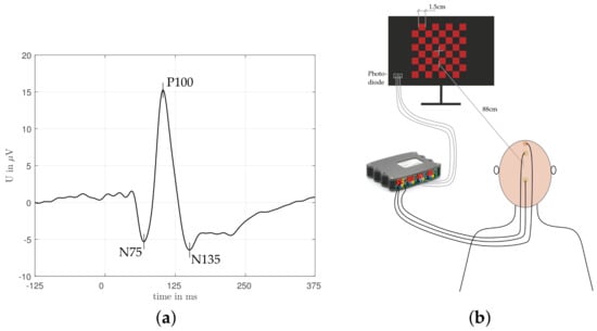 All sensory perceptions, thoughts and ideas can be understood as cerebral electrical excitation patterns. However, to date, it has not been clarified in detail which excitation pattern corresponds to which sensory perception. Several approaches in brain research are used to identify which areas of the cortex are particularly activated during certain sensory perceptions or activities. One of them is the acquisition of evoked potentials (EPs), which means to measure and evaluate the response of the brain to a specific stimulus. Depending on the type of the stimulus, there exist well-known techniques, such as capturing visually evoked potentials (VEPs), auditory evoked potentials (AEPs), and somatosensory evoked potentials (SSEPs), and more uncommon ones, such as EPs, based on gustatory, olfactory, and pain stimulation [1]. The field of application is very broad, for instance, early diagnosis and monitoring of a specific disease, usage within a brain computer interface (BCI) [2,3], and prediction of a long-term disability [4], etc. Although imaging methods, such as magnetic resonance imaging (MRI), have replaced EPs in some applications, for instance, in diagnosis of multiple sclerosis (MS), EPs still have crucial advantages. First, the measurement setup is non-invasive and at low cost; second, the temporal resolution is very high (i.e., in the range of ms) and the stimulus may be repeated several times to increase the signal quality; and third, the subject does not necessarily need to be conscious. In particular, the use of EPs during general anesthesia has increased their impact in clinical studies. Predicting post-operative visual output [5,6] or estimating the depth of anesthesia based on AEPs are only two examples [7,8]. Additionally, EPs are useful in follow-up and for monitoring the effect of a therapy or the disease course.