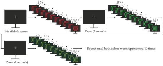 Furthermore, one may argue that the observed small differences in latency, steepness, and area of the VEPs could be explained by varying attention or vigilance and, consequently, would not be caused by the different colors. However, due to the selected order of the stimulus presentation, it is very unlikely that varying attention and vigilance cause the differences. As stated in Section 2 and depicted in Figure 2, the colors were represented in a random order (e.g., red, red, green, red, green, green, red, ...) and not block-wise (e.g., red, red, red, ..., red, green, green, green, ..., green). Therefore, fading attention should equally impact the VEPs of both colors.