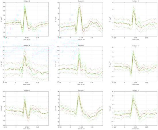 Each volunteer went through the complete test protocol; none had to interrupt the study, for technical reasons, and as a consequence, all measurements of all participants were obtained within one session. A total of 1440 checkerboard flickers were recorded for every volunteer, resulting in 160 labeled averaged sweeps for each of them. Figure 3 shows a color-coded depiction of the averaged VEPs for every volunteer. In all subjects, the mean VEPs (across all single trials) differ. However, we also notice that the standard deviations of the VEPs are very high.