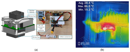 (a) The power supply module (PSM) consists of a DC-DC convertor, a heat sink, cooling fans, and a backup battery for emergency landing; (b) The thermal image of the DC-DC convertor providing 30 A at 24 V.