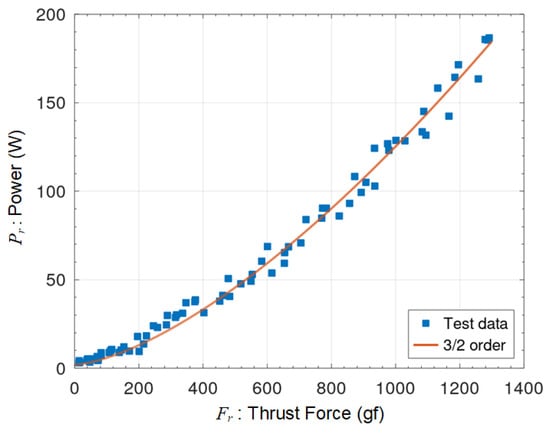 where is the thrust force produced by the rotor, is a figure of merit of the rotor, is the density of air, and is the swept area of the propeller. The test data are shown in Figure 3, and the 3/2 order fitted regression becomes Equation (3).