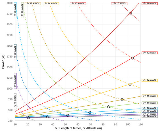 A long tether containing copper filaments has a significant weight. The lightest option in the market is the 44A012X series (TE connectivity, USA) unshielded, unjacketed, general purpose, 600 V, two conductor 1-pair twisted cable. The weight and resistivity per unit length are listed in Table 3. Substituting these parameters into the above mathematical model, we have Figure 4 showing the overall performance of different tether size in American Wire Gage (AWG). The solid lines, derived by Equation (1), indicate the needed power versus the tether’s length. Their slope is positive because more power is needed for hanging a heavier tether in the air. On the other hand, the dash lines, derived by Equation (7), indicate the received power versus the tether’s length. Their slope is negative because more voltage is dropped due to the higher resistance. For a certain tether size, the junction of the solid line and the dash line indicates the maximum altitude and its corresponding power, which are summarized in Figure 5.